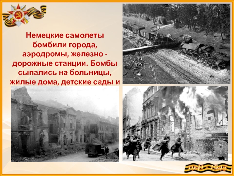 Слайд 4Немецкие самолеты бомбили города, аэродромы, железно - дорожные станции. Бомбы сыпались