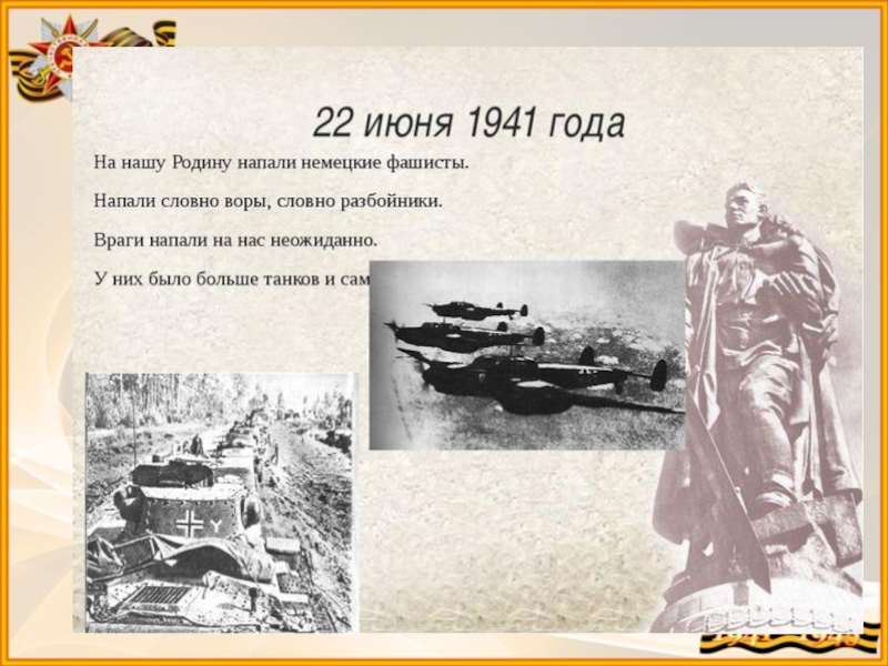 Внезапно мирную жизнь нарушили взрывы снарядов. Это фашистские захватчики напали на нашу Родину, началась Великая отечественная война.