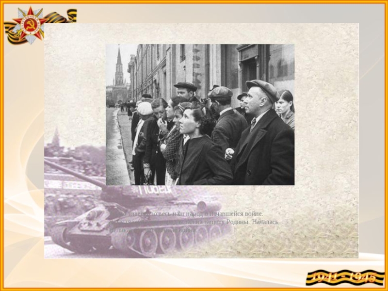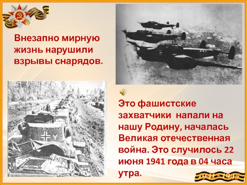 Внезапно мирную жизнь нарушили взрывы снарядов. Это фашистские захватчики напали на нашу Родину, началась Великая отечественная война. Это случилось 22 июня 1941 года в 04 часа утра.