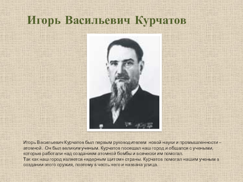 промышленности – атомной. Он был великим ученым. Курчатов посещал наш город и общался с учеными, которые работали над созданием атомной бомбы и всячески им помогал.