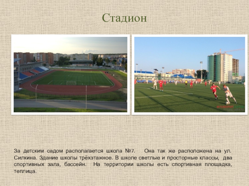 на ул. Силкина. Здание школы трёхэтажное. В школе светлые и просторные классы, два спортивных зала, бассейн. На территории школы есть спортивная площадка, теплица.