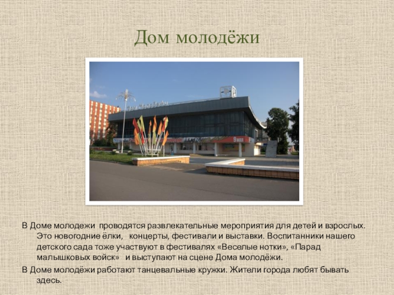 В Доме молодёжи работают танцевальные кружки. Жители города любят бывать здесь.