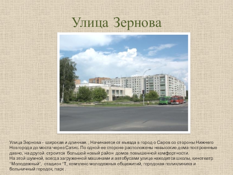 Улица Зернова - широкая и длинная. , Начинается от въезда