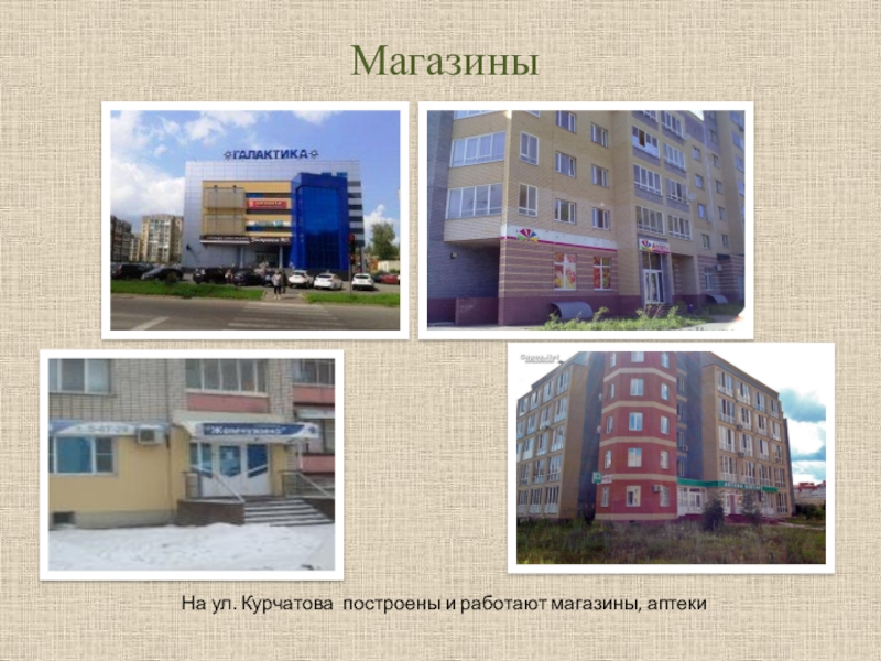 Слайд 11На ул. Курчатова построены и работают магазины, аптеки