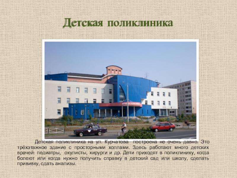 построена не очень давно. Это трёхэтажное здание с просторными холлами. Здесь работают много детских врачей: педиатры, окулисты, хирурги и др. Дети приходят в поликлинику, когда болеют или когда нужно получить справку в детский сад или школу, сделать прививку, сдать анализы.