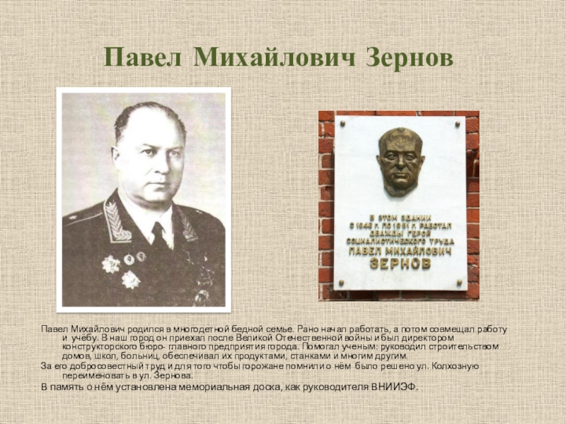 работать, а потом совмещал работу и учёбу. В наш город он приехал после Великой Отечественной войны и был директором конструкторского бюро- главного предприятия города. Помогал ученым: руководил строительством домов, школ, больниц, обеспечивал их продуктами, станками и многим другим.