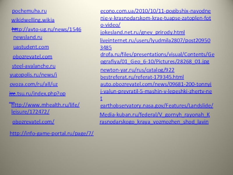 pochemuha.ruwikidwelling.wikia…http://avto-ug.ru/news/1546newsland.ruauto.obozrevatel.com/news/09681-200-tonnyij-valun-prevratil-5-mashin-v-lepeshki-zhertv-netuastudent.comearthobservatory.nasa.gov/Features/Landslide/obozrevatel.comsteel-avalanche.ruMedia-kuban.ru/federal/V_gornyh_rayonah_Krasnodarskogo_kraya_vozmozhen_shod_lavinyugopolis.ru/news/iice.tsu.ru/index.php?op…ovoza.com/ru/all/uz…econo.com.ua/2010/10/11-pogibshix-navodnenie-v-krasnodarskom-krae-tuapse-zatoplen-foto-video/jokesland.net.ru/gnev_prirody.htmlliveinternet.ru/users/lyudmila2807/post209503485drofa.ru/files/presentations/visual/Contents/Geografiya/01_Geo_6-10/Pictures/28268_01.jpgnewton-yar.ru/rus/catalog/922bestreferat.ru/referat-179345.htmlhttp://www.mhealth.ru/life/leisure/172472/obozrevatel.com/http://info-game-portal.ru/page/7/
