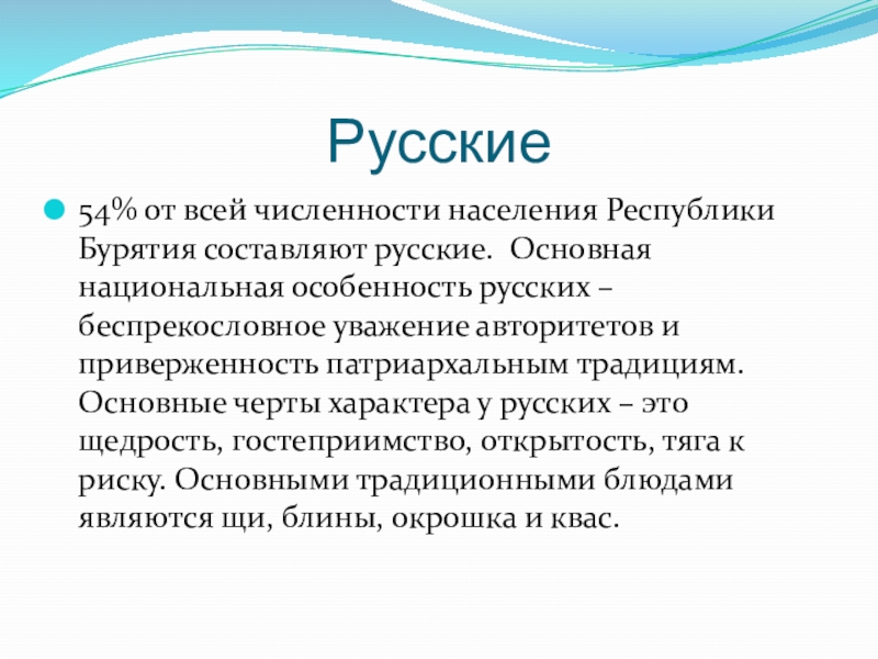 особенность русских – беспрекословное уважение авторитетов и приверженность патриархальным традициям. Основные черты характера у русских – это щедрость, гостеприимство, открытость, тяга к риску. Основными традиционными блюдами являются щи, блины, окрошка и квас.