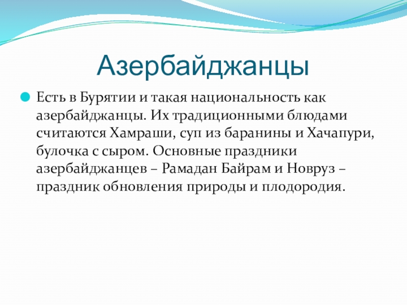 считаются Хамраши, суп из баранины и Хачапури, булочка с сыром. Основные праздники азербайджанцев – Рамадан Байрам и Новруз – праздник обновления природы и плодородия.