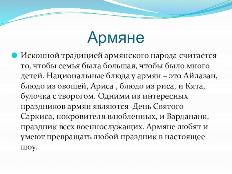 было много детей. Национальные блюда у армян – это Айлазан, блюдо из овощей, Ариса , блюдо из риса, и Кята, булочка с творогом. Одними из интересных праздников армян являются День Святого Саркиса, покровителя влюбленных, и Вардананк, праздник всех военнослужащих. Армяне любят и умеют превращать любой праздник в настоящее шоу.