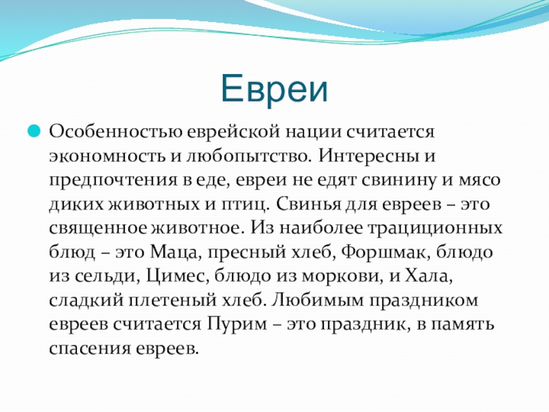 еде, евреи не едят свинину и мясо диких животных и птиц. Свинья для евреев – это священное животное. Из наиболее трациционных блюд – это Маца, пресный хлеб, Форшмак, блюдо из сельди, Цимес, блюдо из моркови, и Хала, сладкий плетеный хлеб. Любимым праздником евреев считается Пурим – это праздник, в память спасения евреев.