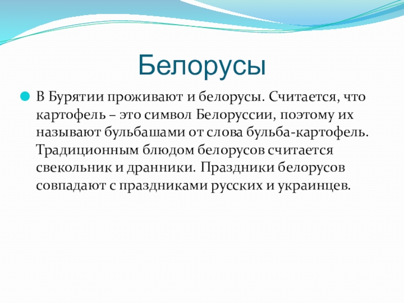Белоруссии, поэтому их называют бульбашами от слова бульба-картофель. Традиционным блюдом белорусов считается свекольник и дранники. Праздники белорусов совпадают с праздниками русских и украинцев.