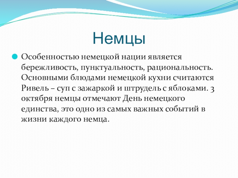 считаются Ривель – суп с зажаркой и штрудель с яблоками. 3 октября немцы отмечают День немецкого единства, это одно из самых важных событий в жизни каждого немца.