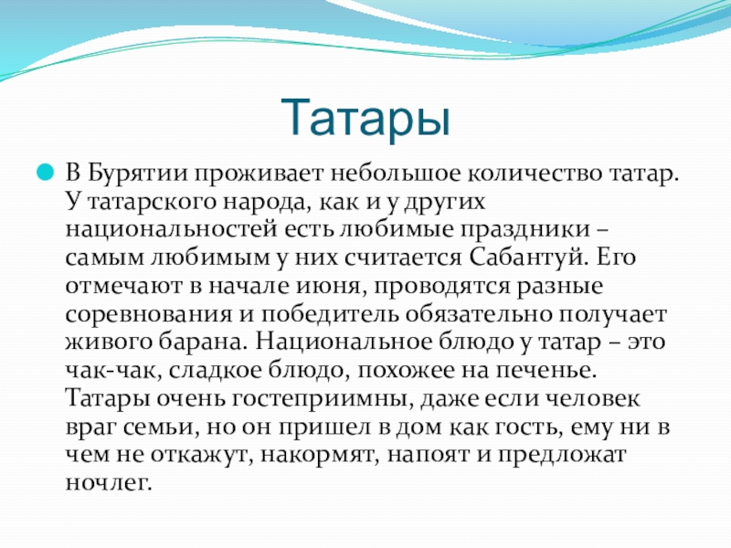 у других национальностей есть любимые праздники – самым любимым у них считается Сабантуй. Его отмечают в начале июня, проводятся разные соревнования и победитель обязательно получает живого барана. Национальное блюдо у татар – это чак-чак, сладкое блюдо, похожее на печенье. Татары очень гостеприимны, даже если человек враг семьи, но он пришел в дом как гость, ему ни в чем не откажут, накормят, напоят и предложат ночлег.