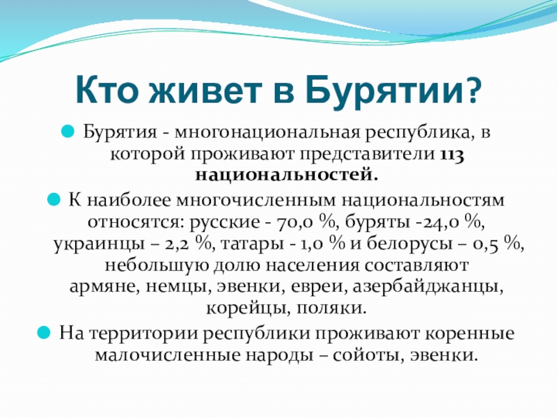 54% от всей численности населения Республики Бурятия составляют русские. Основная национальная