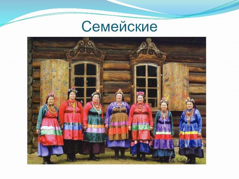 называют семейские, потому что селились они большими семьями, по нескольку домов. Дома семейских отличались от других домов, они всегда украшены искусной резьбой и выкрашены в яркие цвета. Также яркими были и национальные костюмы семейских.В украшениях преобладает – янтарь.