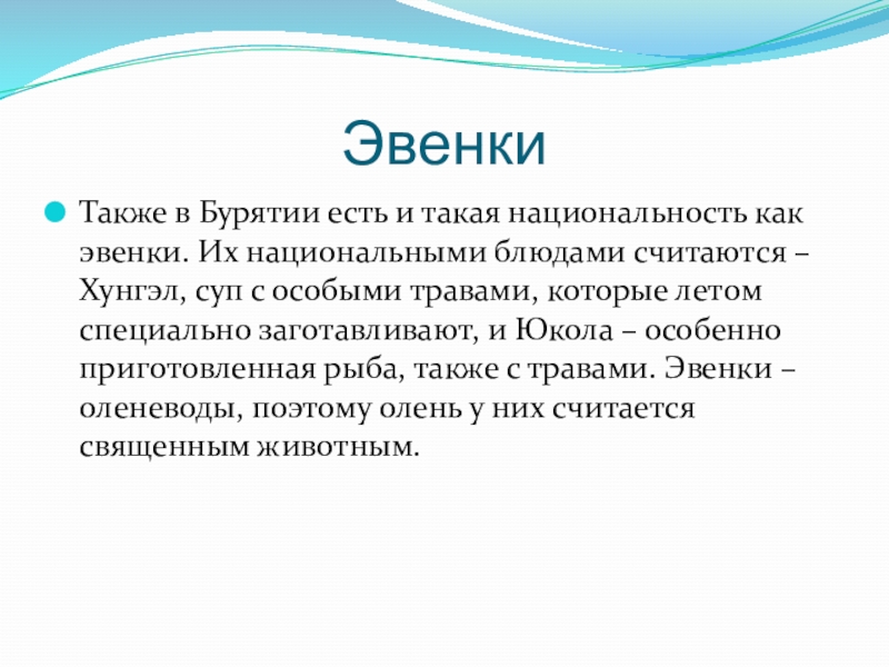 блюдами считаются – Хунгэл, суп с особыми травами, которые летом специально заготавливают, и Юкола – особенно приготовленная рыба, также с травами. Эвенки – оленеводы, поэтому олень у них считается священным животным.