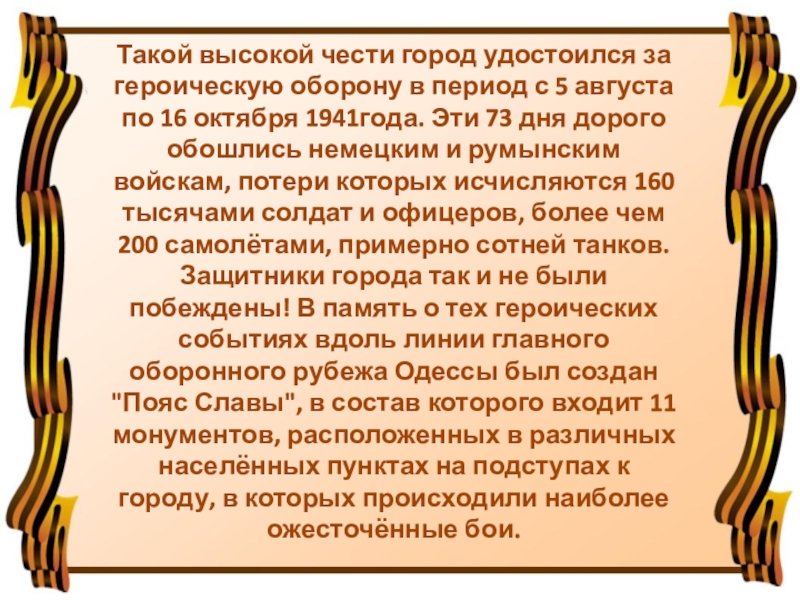 Защитники города так и не были побеждены! В память о тех героических событиях вдоль линии главного оборонного рубежа Одессы был создан "Пояс Славы", в состав которого входит 11 монументов, расположенных в различных населённых пунктах на подступах к городу, в которых происходили наиболее ожесточённые бои.