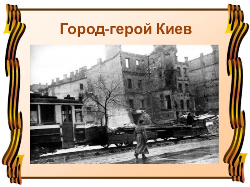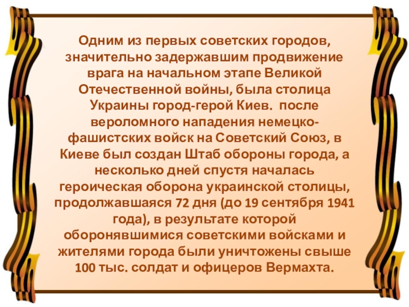 этапе Великой Отечественной войны, была столица Украины город-герой Киев. после вероломного нападения немецко-фашистских войск на Советский Союз, в Киеве был создан Штаб обороны города, а несколько дней спустя началась героическая оборона украинской столицы, продолжавшаяся 72 дня (до 19 сентября 1941 года), в результате которой оборонявшимися советскими войсками и жителями города были уничтожены свыше 100 тыс. солдат и офицеров Вермахта.