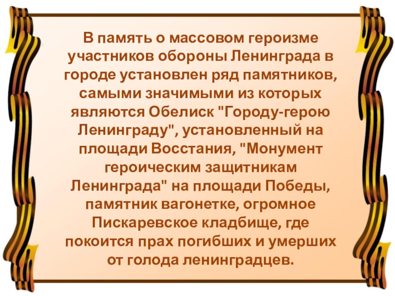 ряд памятников, самыми значимыми из которых являются Обелиск "Городу-герою Ленинграду", установленный на площади Восстания, "Монумент героическим защитникам Ленинграда" на площади Победы, памятник вагонетке, огромное Пискаревское кладбище, где покоится прах погибших и умерших от голода ленинградцев.
