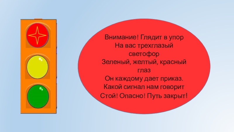 Внимание! Глядит в упорНа вас трехглазый светофорЗеленый, желтый, красный глазОн каждому дает приказ.Какой сигнал нам говоритСтой! Опасно!