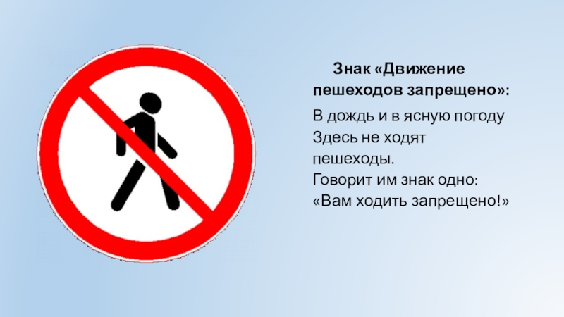 Знак «Движение пешеходов запрещено»:В дождь и в ясную погоду Здесь не ходят пешеходы.