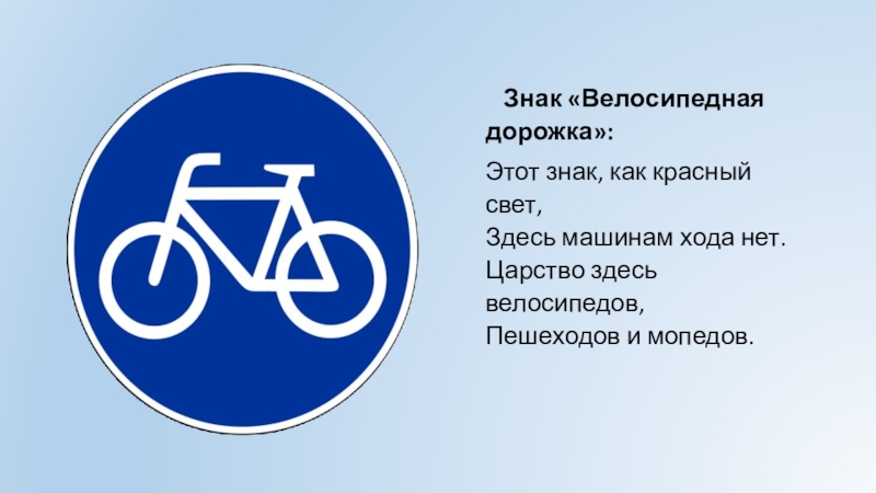 Знак «Велосипедная дорожка»:Этот знак, как красный свет, Здесь машинам хода нет. Царство здесь