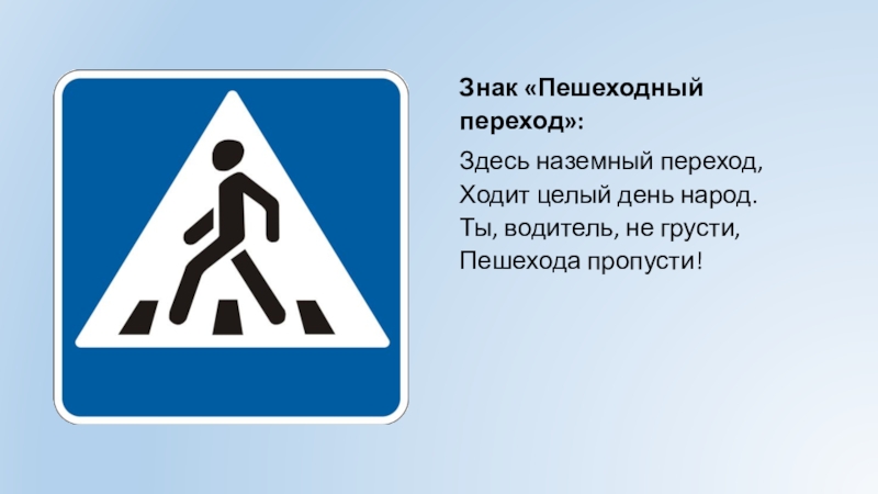 . Знак «Пешеходный переход»:Здесь наземный переход, Ходит целый день народ. Ты, водитель, не грусти, Пешехода пропусти!