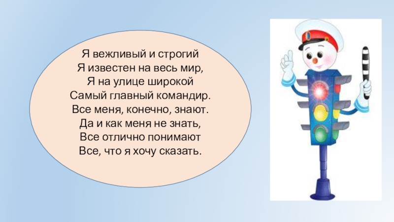 Я вежливый и строгийЯ известен на весь мир,Я на улице широкойСамый главный командир.Все меня, конечно, знают.Да и как меня не знать,Все отлично понимаютВсе, что я хочу сказать.