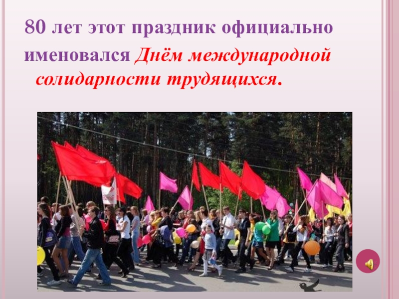 80 лет этот праздник официальноименовался Днём международной солидарности трудящихся.