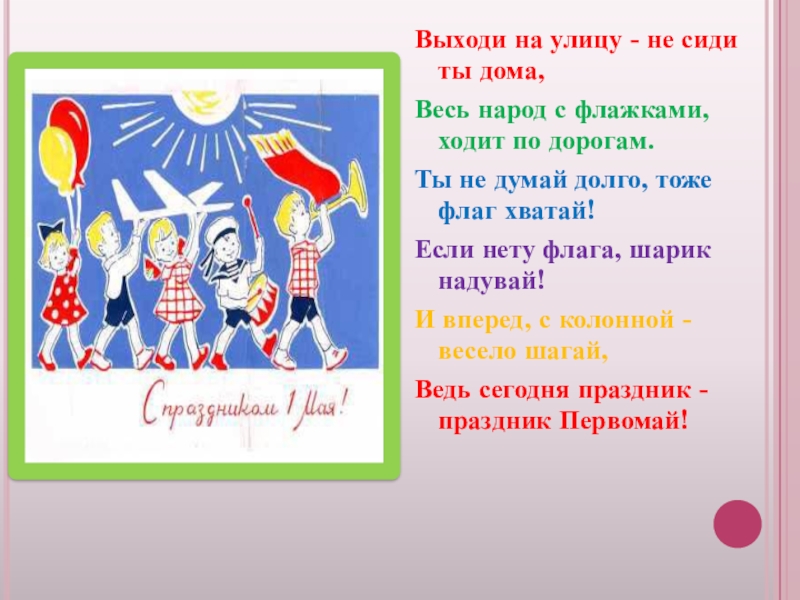 Выходи на улицу - не сиди ты дома,Весь народ с флажками, ходит по дорогам.Ты не думай долго,