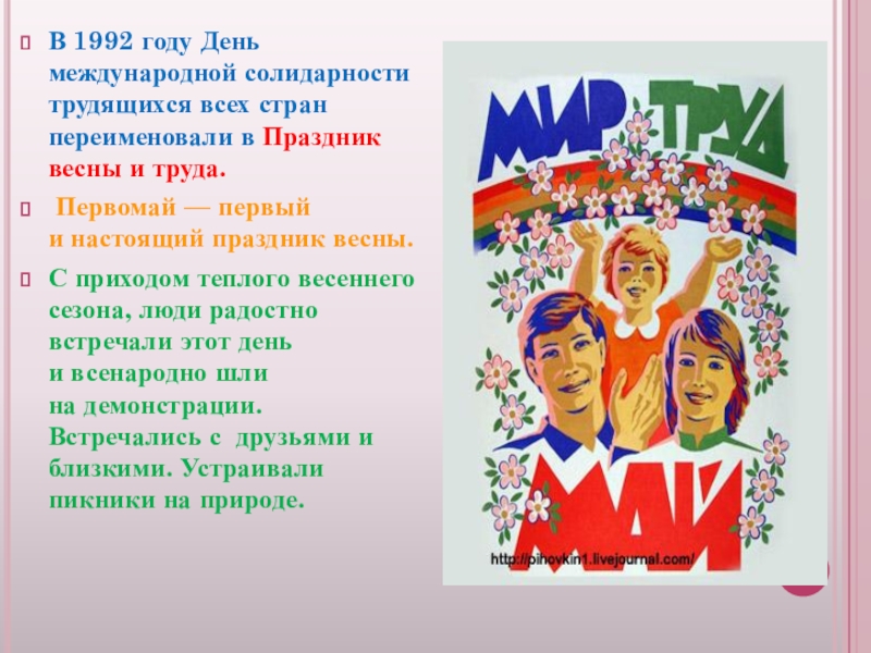 Слайд 7В 1992 году День международной солидарности трудящихся всех стран переименовали в Праздник весны