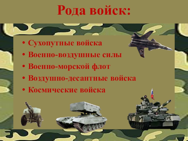 Рода войск:Сухопутные войскаВоенно-воздушные силыВоенно-морской флотВоздушно-десантные войскаКосмические войска