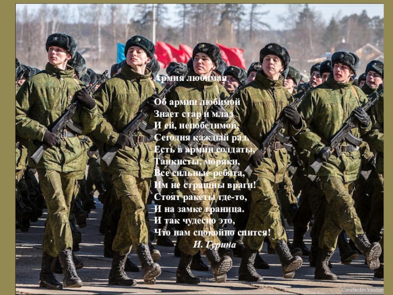 Слайд 24Армия любимая  Об армии любимой Знает стар и млад И ей, непобедимой, Сегодня каждый рад. Есть