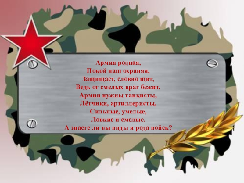 Армия родная,Покой наш охраняя, Защищает, словно щит, Ведь от смелых враг бежит.Армии нужны танкисты,Лётчики, артиллеристы, Сильные, умелые, Ловкие и смелые.А знаете ли вы виды и рода войск?