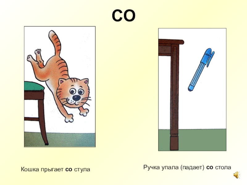 СОКошка прыгает со стулаРучка упала (падает) со стола