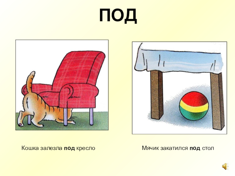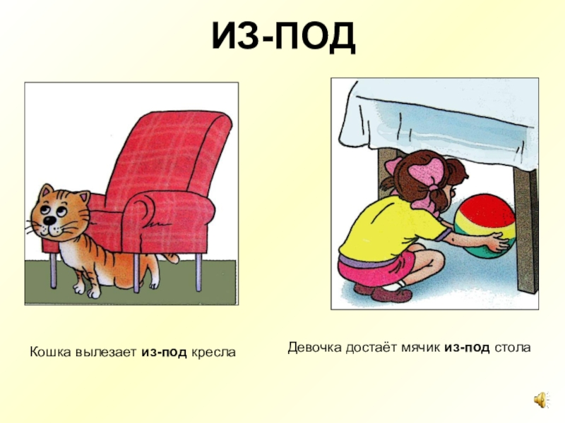 ИЗ-ПОДКошка вылезает из-под креслаДевочка достаёт мячик из-под стола