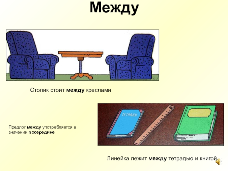 МеждуСтолик стоит между кресламиЛинейка лежит между тетрадью и книгойПредлог между употребляется в значении посередине