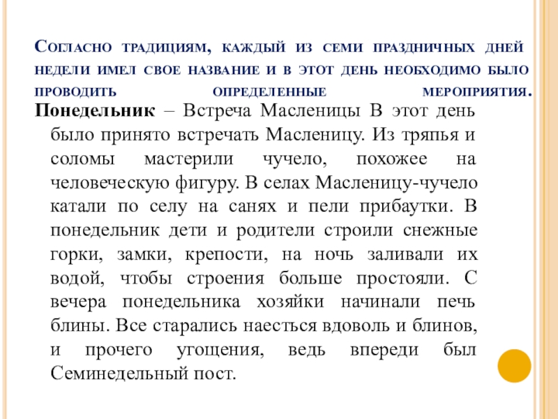 Понедельник – Встреча Масленицы В этот день было принято встречать Масленицу. Из тряпья и соломы мастерили чучело, похожее на человеческую фигуру. В селах Масленицу-чучело катали по селу на санях и пели прибаутки. В понедельник дети и родители строили снежные горки, замки, крепости, на ночь заливали их водой, чтобы строения больше простояли. С вечера понедельника хозяйки начинали печь блины. Все старались наесться вдоволь и блинов, и прочего угощения, ведь впереди был Семинедельный пост.