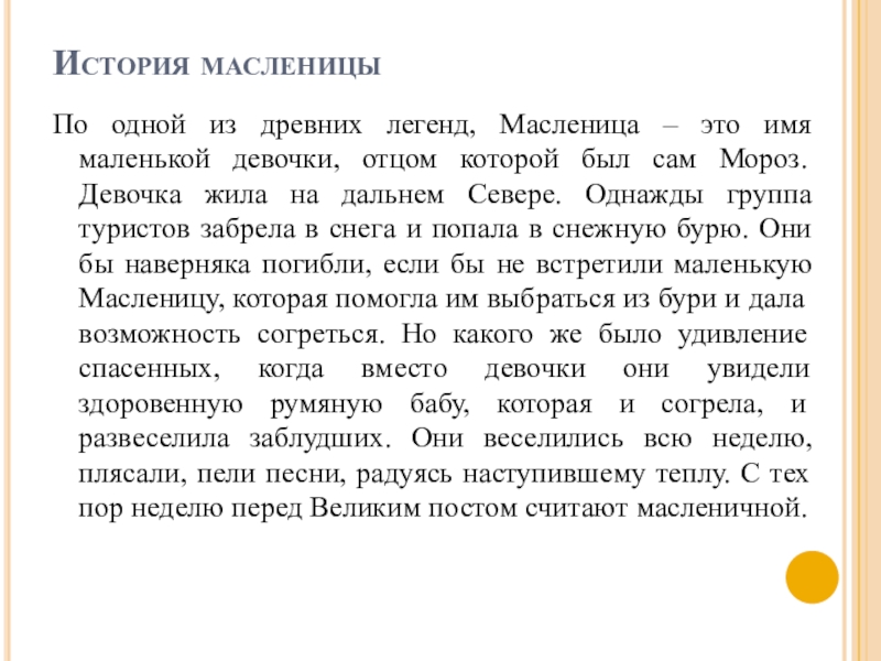 девочки, отцом которой был сам Мороз. Девочка жила на дальнем Севере. Однажды группа туристов забрела в снега и попала в снежную бурю. Они бы наверняка погибли, если бы не встретили маленькую Масленицу, которая помогла им выбраться из бури и дала возможность согреться. Но какого же было удивление спасенных, когда вместо девочки они увидели здоровенную румяную бабу, которая и согрела, и развеселила заблудших. Они веселились всю неделю, плясали, пели песни, радуясь наступившему теплу. С тех пор неделю перед Великим постом считают масленичной.
