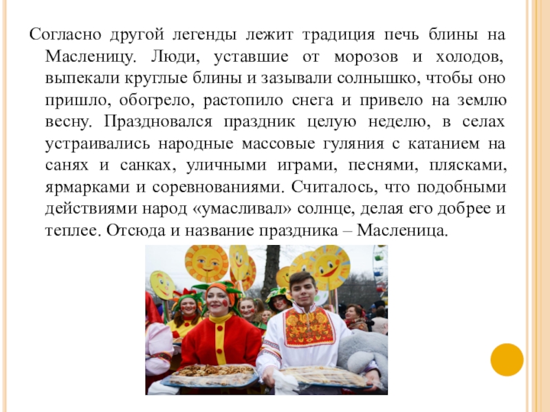 Слайд 4Согласно другой легенды лежит традиция печь блины на Масленицу. Люди, уставшие