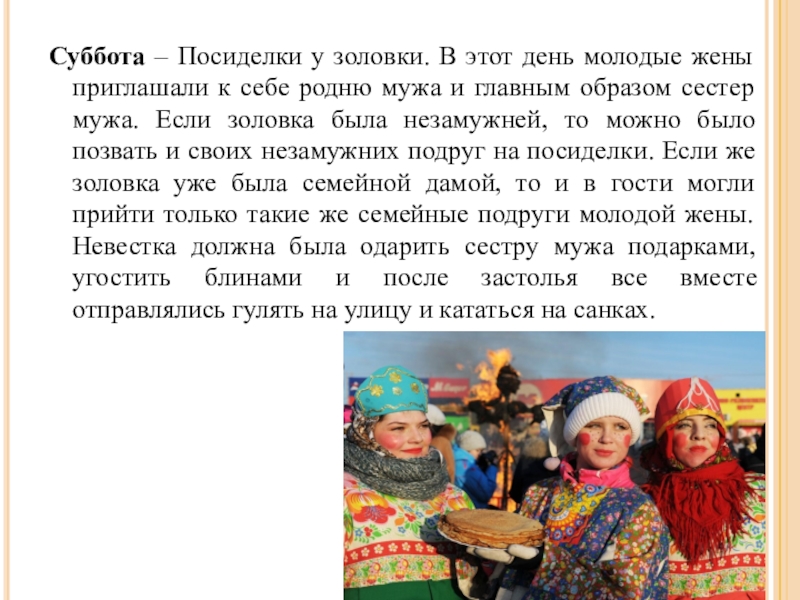 к себе родню мужа и главным образом сестер мужа. Если золовка была незамужней, то можно было позвать и своих незамужних подруг на посиделки. Если же золовка уже была семейной дамой, то и в гости могли прийти только такие же семейные подруги молодой жены. Невестка должна была одарить сестру мужа подарками, угостить блинами и после застолья все вместе отправлялись гулять на улицу и кататься на санках.