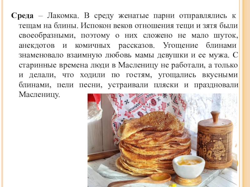 Слайд 8Среда – Лакомка. В среду женатые парни отправлялись к тещам на