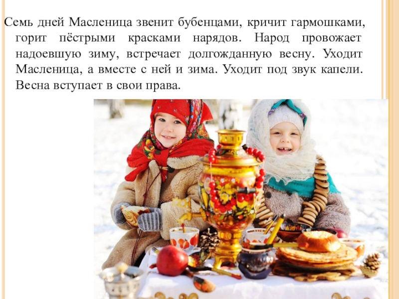 Слайд 13Семь дней Масленица звенит бубенцами, кричит гармошками, горит пёстрыми красками нарядов.