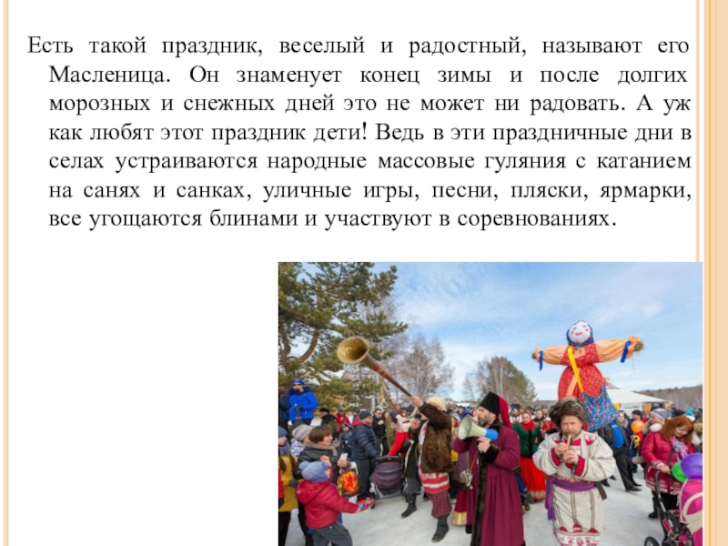 конец зимы и после долгих морозных и снежных дней это не может ни радовать. А уж как любят этот праздник дети! Ведь в эти праздничные дни в селах устраиваются народные массовые гуляния с катанием на санях и санках, уличные игры, песни, пляски, ярмарки, все угощаются блинами и участвуют в соревнованиях.