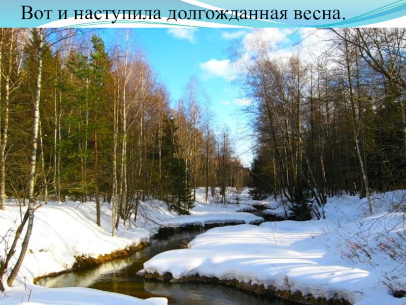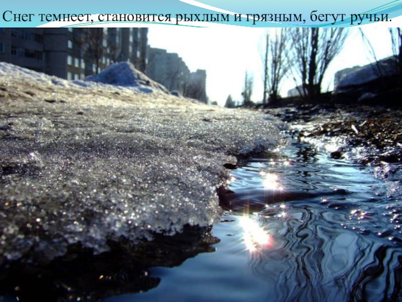 Слайд 5Снег темнеет, становится рыхлым и грязным, бегут ручьи.