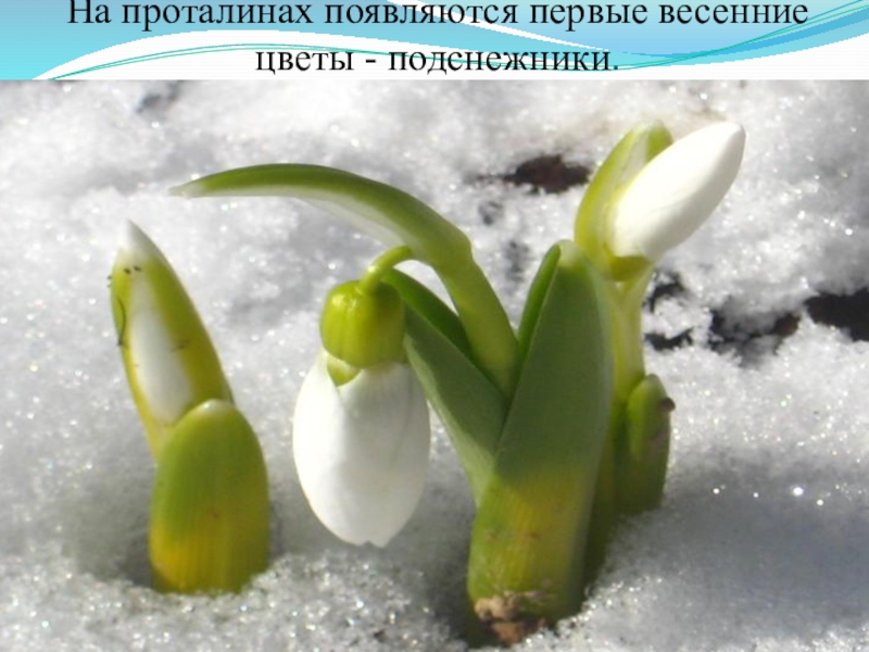 Слайд 7 На проталинах появляются первые весенние цветы - подснежники.