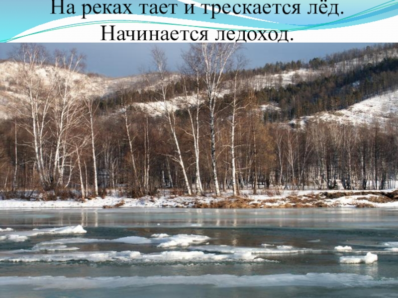Слайд 8На реках тает и трескается лёд. Начинается ледоход.