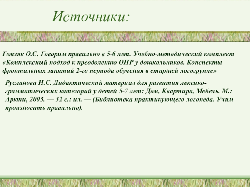 Русланова Н.С. Дидактический материал для развития лексико-грамматических категорий у детей 5-7 лет: Дом, Квартира, Мебель. М.: Аркти, 2005. — 32 с.: ил. — (Библиотека практикующего логопеда. Учим произносить правильно).