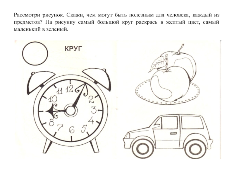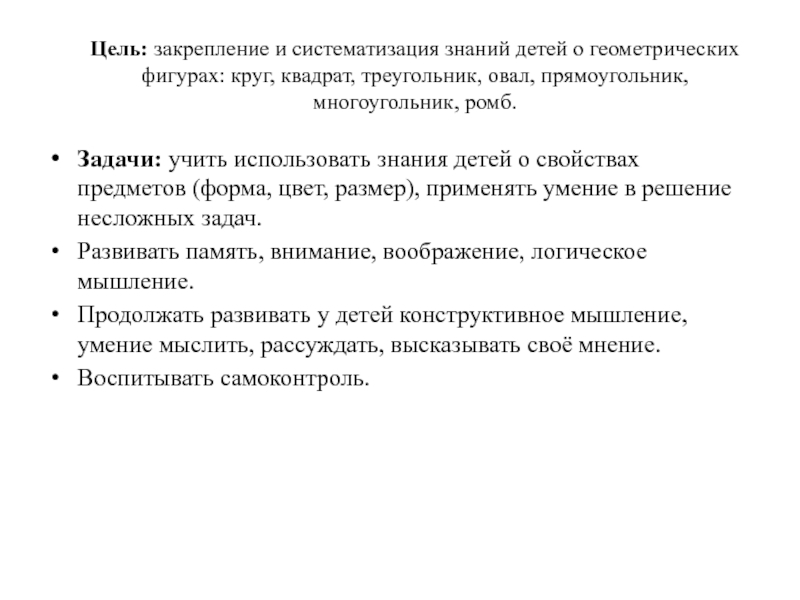 Задачи: учить использовать знания детей о свойствах предметов (форма, цвет, размер), применять умение в решение несложных задач.